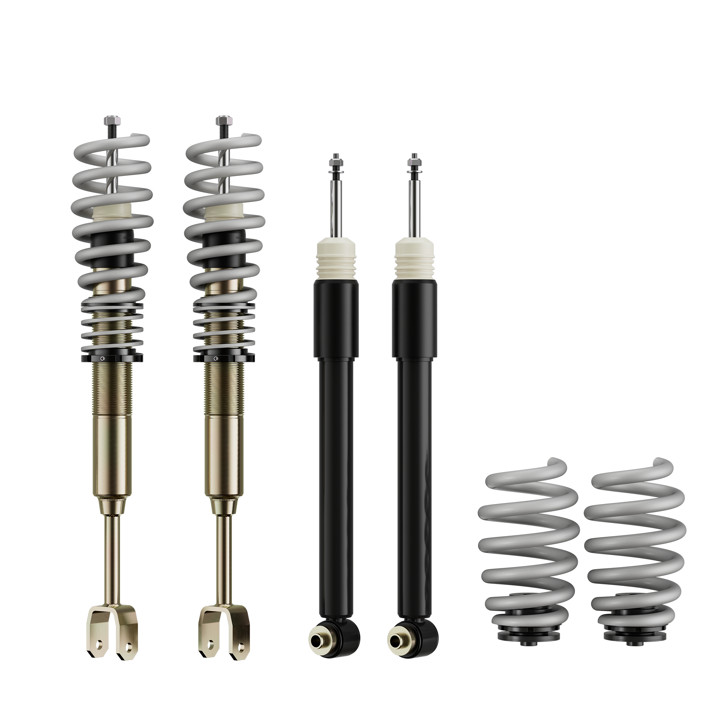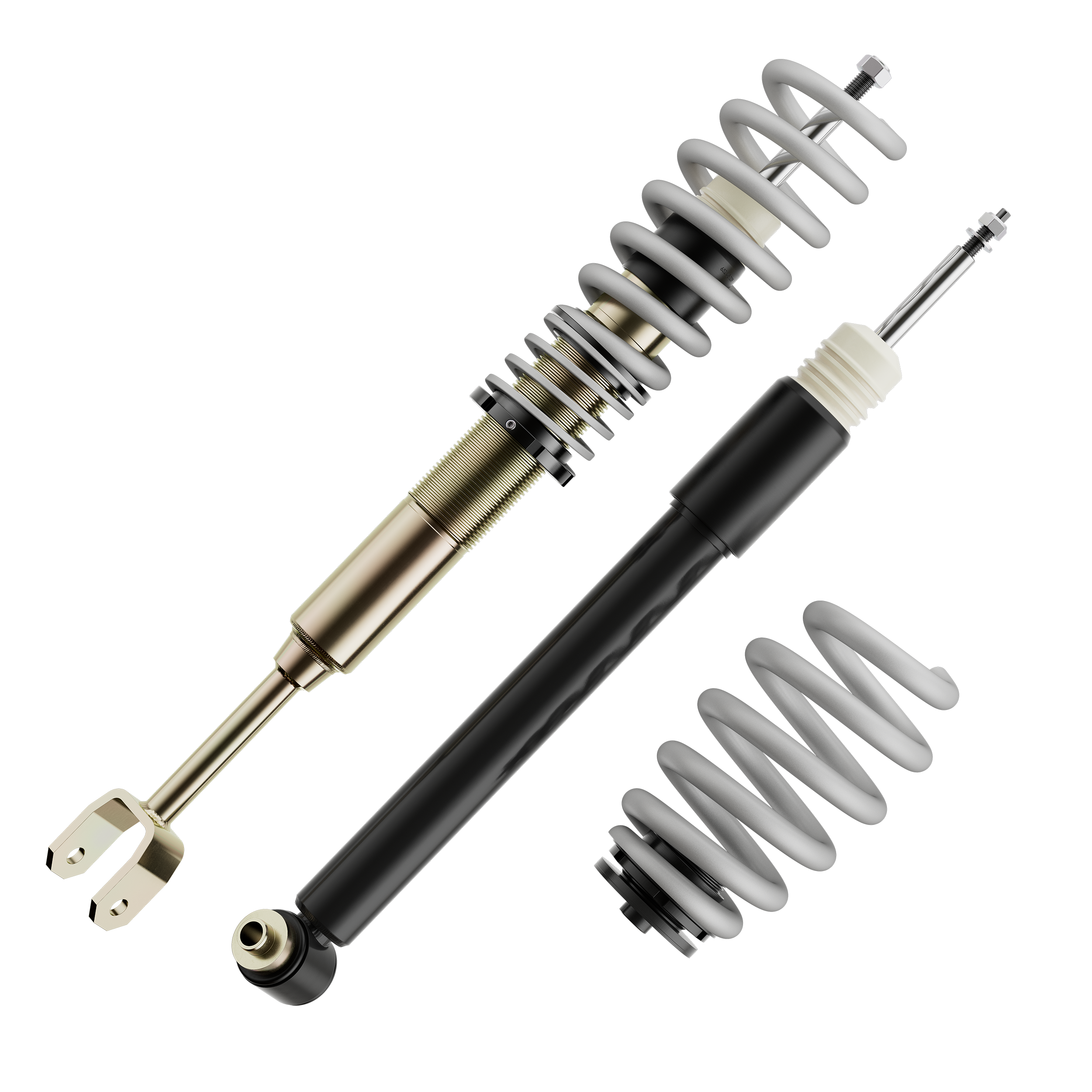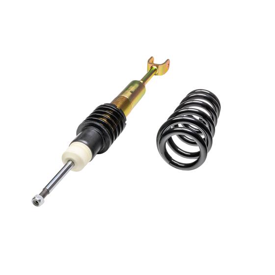 Die mehrfach vergüteten Federn sind durch ihre schwarze Beschichtung in jedem Radhaus ein Hingucker. Auch die verzinkten Federbeine und lackierten Dämpfer halten, wie ein Serienfahrwerk, den unterschiedlichsten Witterungsverhältnissen stand, sowie auch die aus Aluminium gefertigten Federteller und Tieferlegungs - Verstellringe mit ihrer ebenso schwarzen Eloxal - Schicht.