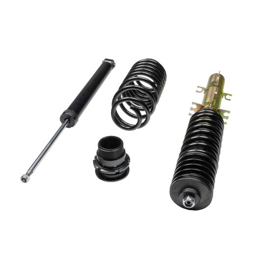 Die mehrfach vergüteten Federn sind durch ihre schwarze Beschichtung in jedem Radhaus ein Hingucker. Auch die verzinkten Federbeine und lackierten Dämpfer halten, wie ein Serienfahrwerk, den unterschiedlichsten Witterungsverhältnissen stand, sowie auch die aus Aluminium gefertigten Federteller und Tieferlegungs - Verstellringe mit ihrer ebenso schwarzen Eloxal - Schicht.