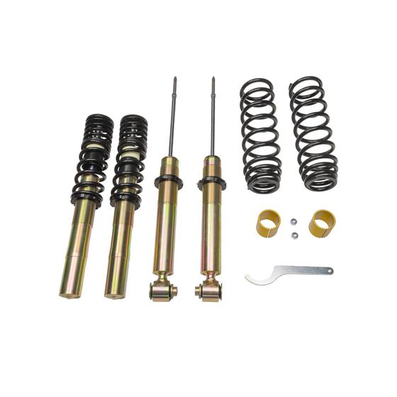 Die mehrfach vergüteten Federn sind durch ihre schwarze Beschichtung in jedem Radhaus ein Hingucker. Auch die verzinkten Federbeine und lackierten Dämpfer halten, wie ein Serienfahrwerk, den unterschiedlichsten Witterungsverhältnissen stand, sowie auch die aus Aluminium gefertigten Federteller und Tieferlegungs - Verstellringe mit ihrer ebenso schwarzen Eloxal - Schicht.