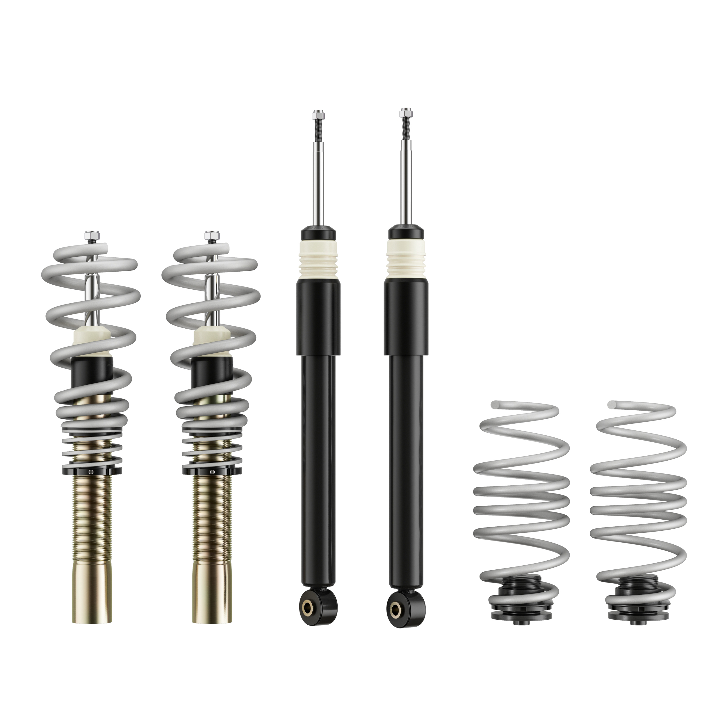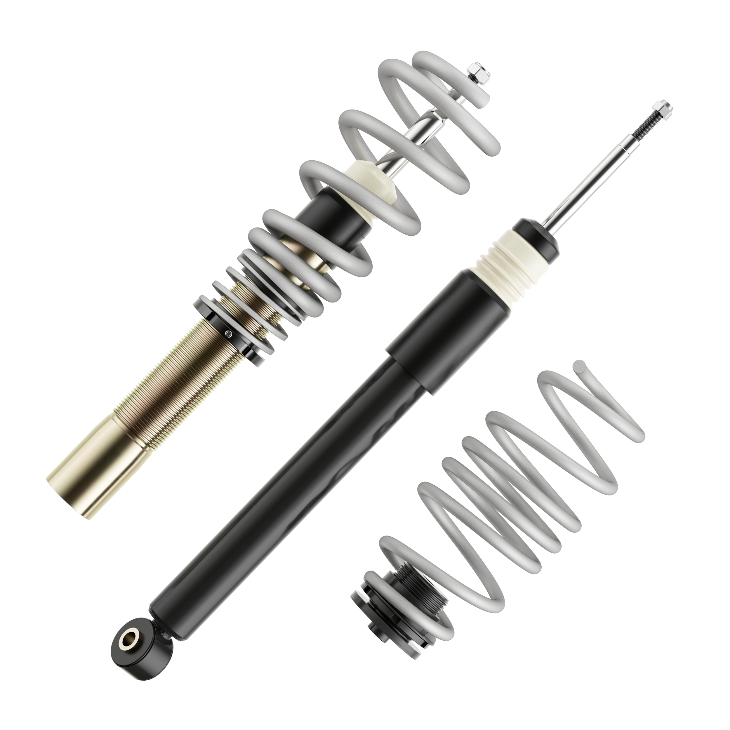 Die mehrfach vergüteten Federn sind durch ihre schwarze Beschichtung in jedem Radhaus ein Hingucker. Auch die verzinkten Federbeine und lackierten Dämpfer halten, wie ein Serienfahrwerk, den unterschiedlichsten Witterungsverhältnissen stand, sowie auch die aus Aluminium gefertigten Federteller und Tieferlegungs - Verstellringe mit ihrer ebenso schwarzen Eloxal - Schicht.