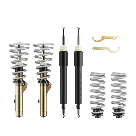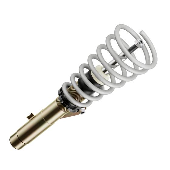 Die mehrfach vergüteten Federn sind durch ihre schwarze Beschichtung in jedem Radhaus ein Hingucker. Auch die verzinkten Federbeine und lackierten Dämpfer halten, wie ein Serienfahrwerk, den unterschiedlichsten Witterungsverhältnissen stand, sowie auch die aus Aluminium gefertigten Federteller und Tieferlegungs - Verstellringe mit ihrer ebenso schwarzen Eloxal - Schicht.