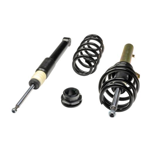 Die mehrfach vergüteten Federn sind durch ihre schwarze Beschichtung in jedem Radhaus ein Hingucker. Auch die verzinkten Federbeine und lackierten Dämpfer halten, wie ein Serienfahrwerk, den unterschiedlichsten Witterungsverhältnissen stand, sowie auch die aus Aluminium gefertigten Federteller und Tieferlegungs - Verstellringe mit ihrer ebenso schwarzen Eloxal - Schicht.
