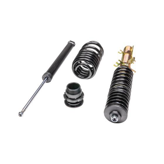 Die mehrfach vergüteten Federn sind durch ihre schwarze Beschichtung in jedem Radhaus ein Hingucker. Auch die verzinkten Federbeine und lackierten Dämpfer halten, wie ein Serienfahrwerk, den unterschiedlichsten Witterungsverhältnissen stand, sowie auch die aus Aluminium gefertigten Federteller und Tieferlegungs - Verstellringe mit ihrer ebenso schwarzen Eloxal - Schicht.