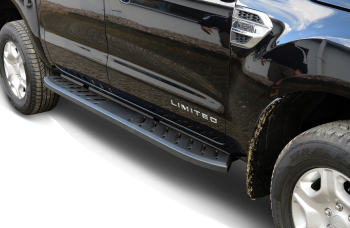 Schwarze, aus Baustahl gefertigte, bullige Trittbretter im unverkennbaren "Shark-Design". Die robusten, stabilen Trittbretter, mit einer gewaltigen Breite von 170 mm verleihen Ihrem Ranger nicht nur einen aggressiven Look, sondern bieten auch zusätzlichen Schutz und sind hilfreich für den einfacheren Ein- und Ausstieg, sowie das Beladen Ihres Autodaches. Die Montage erfolgt an vorhandenen Befestigungspunkten ohne zu bohren.